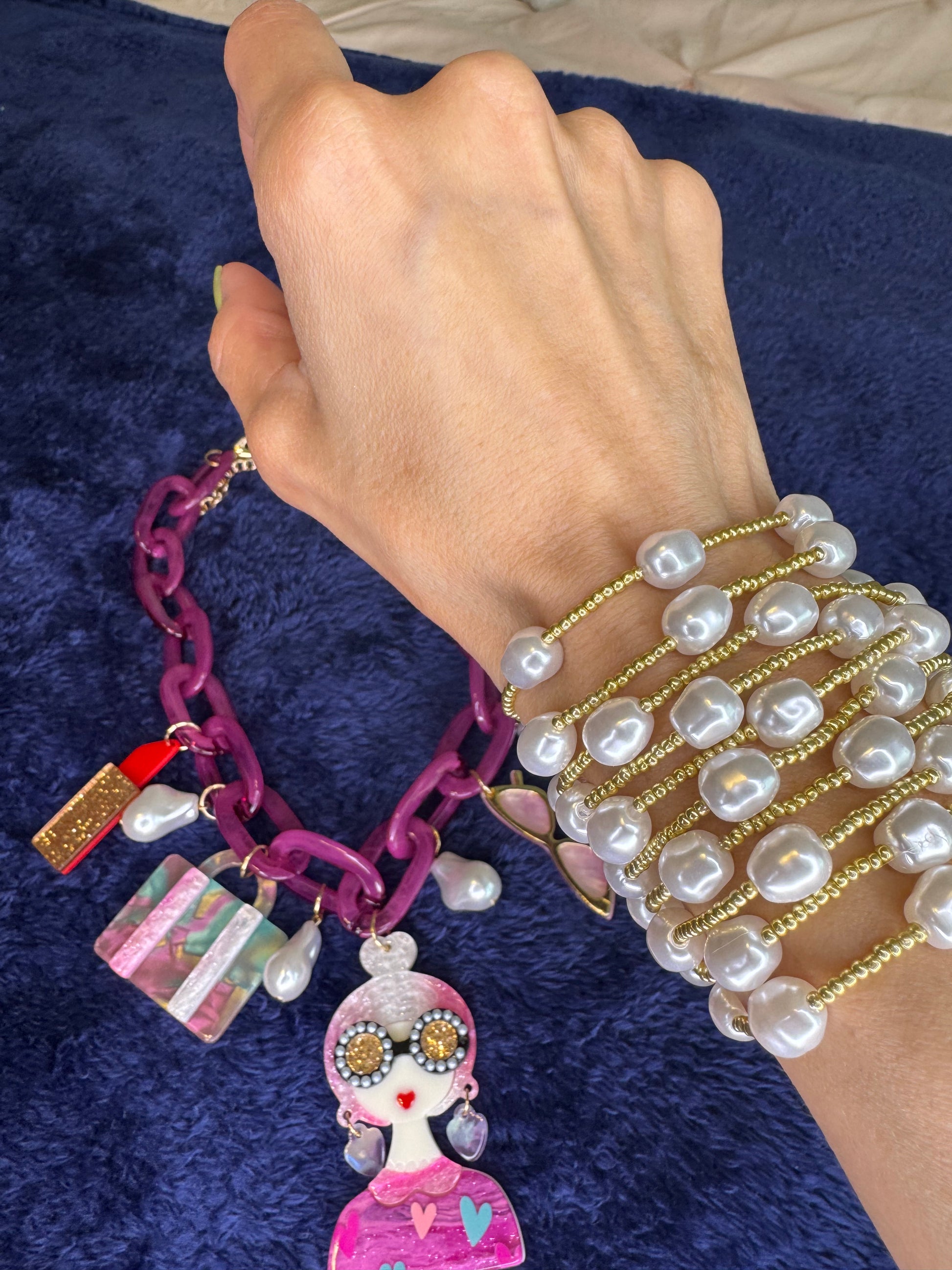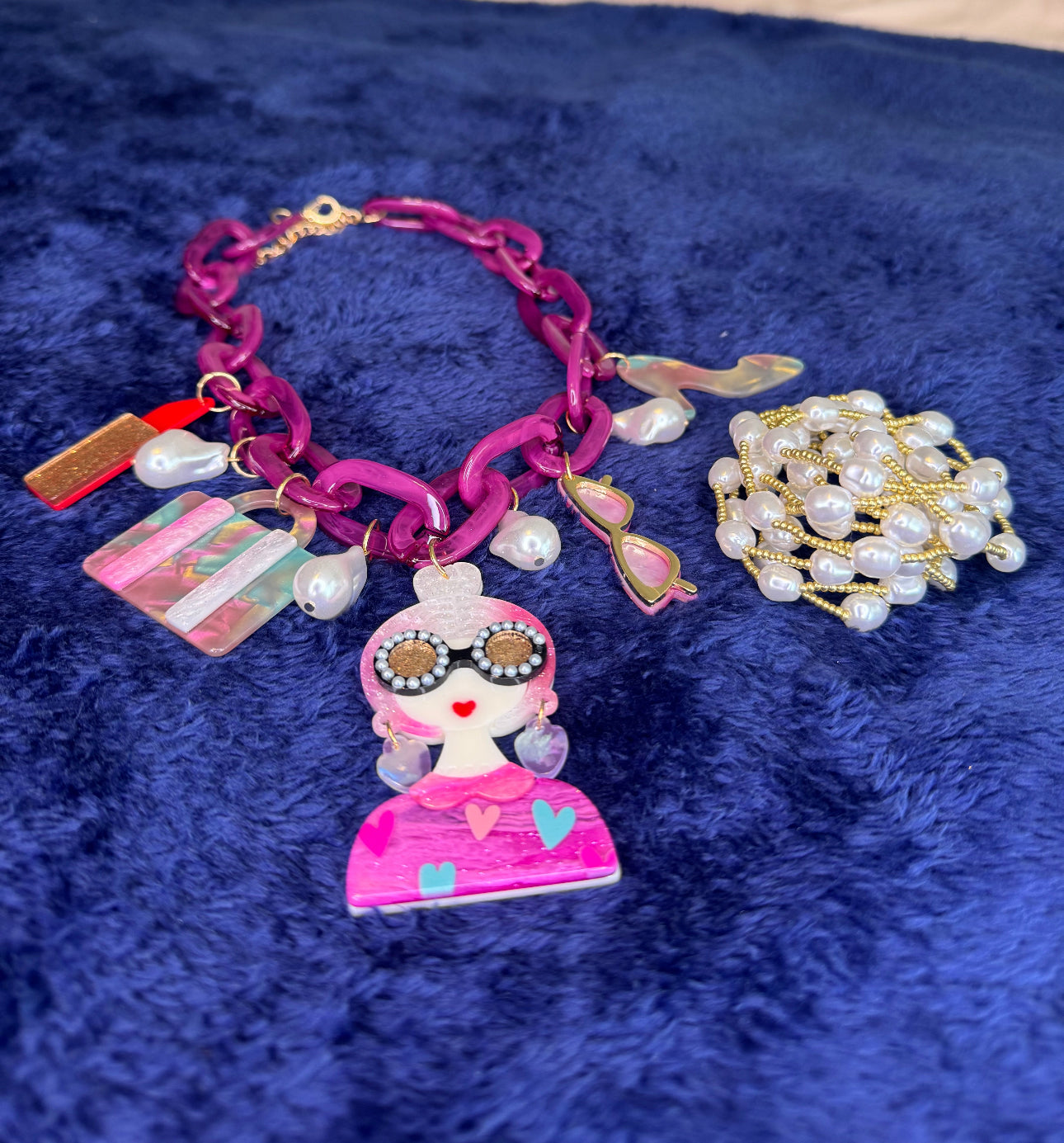 Collar acrilico fuscia con dijes y perlas, combinado con un mix de pulseras de perlitas!