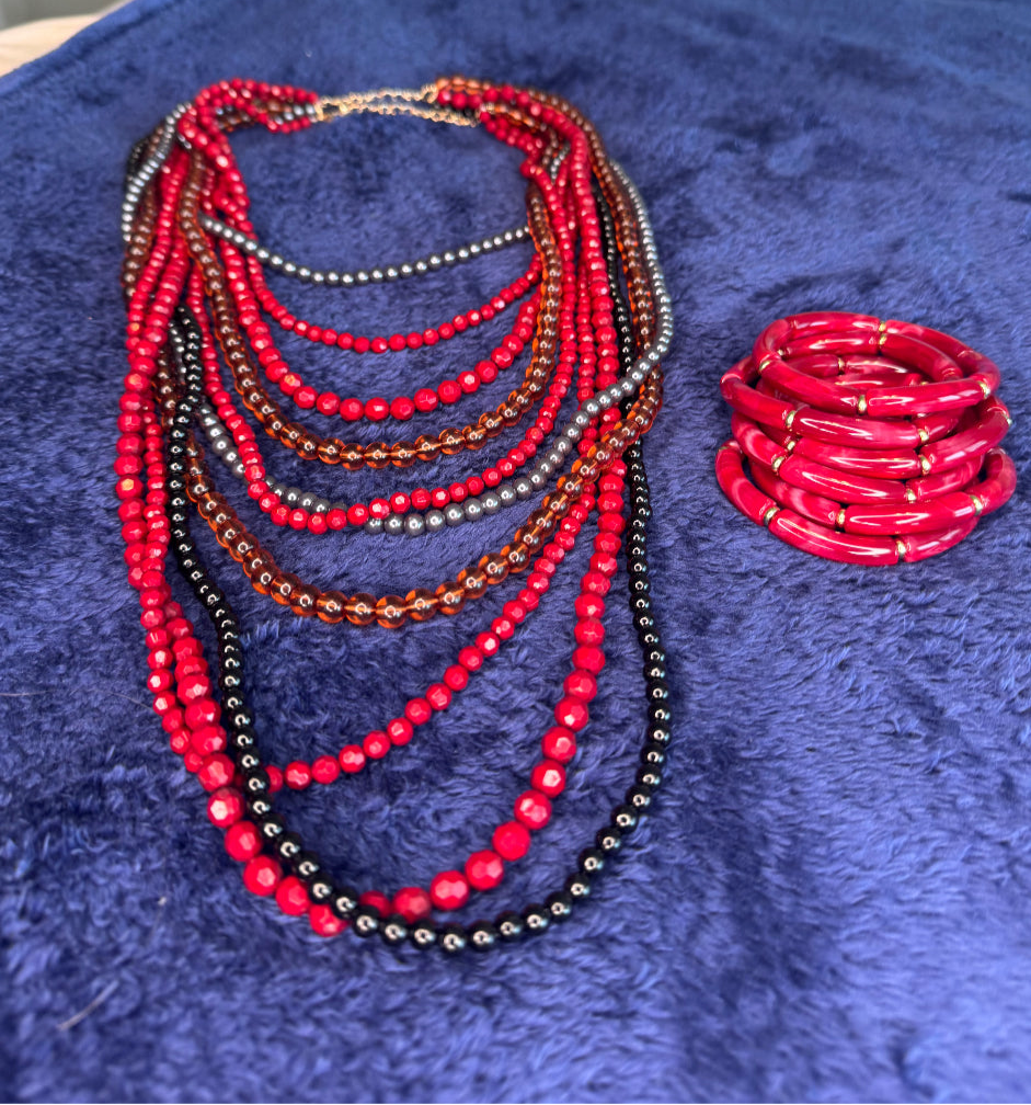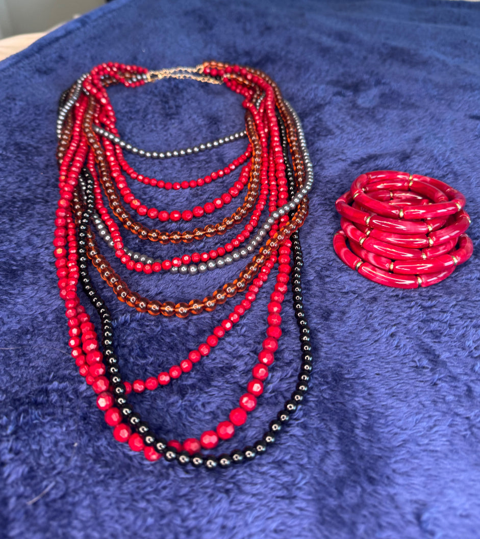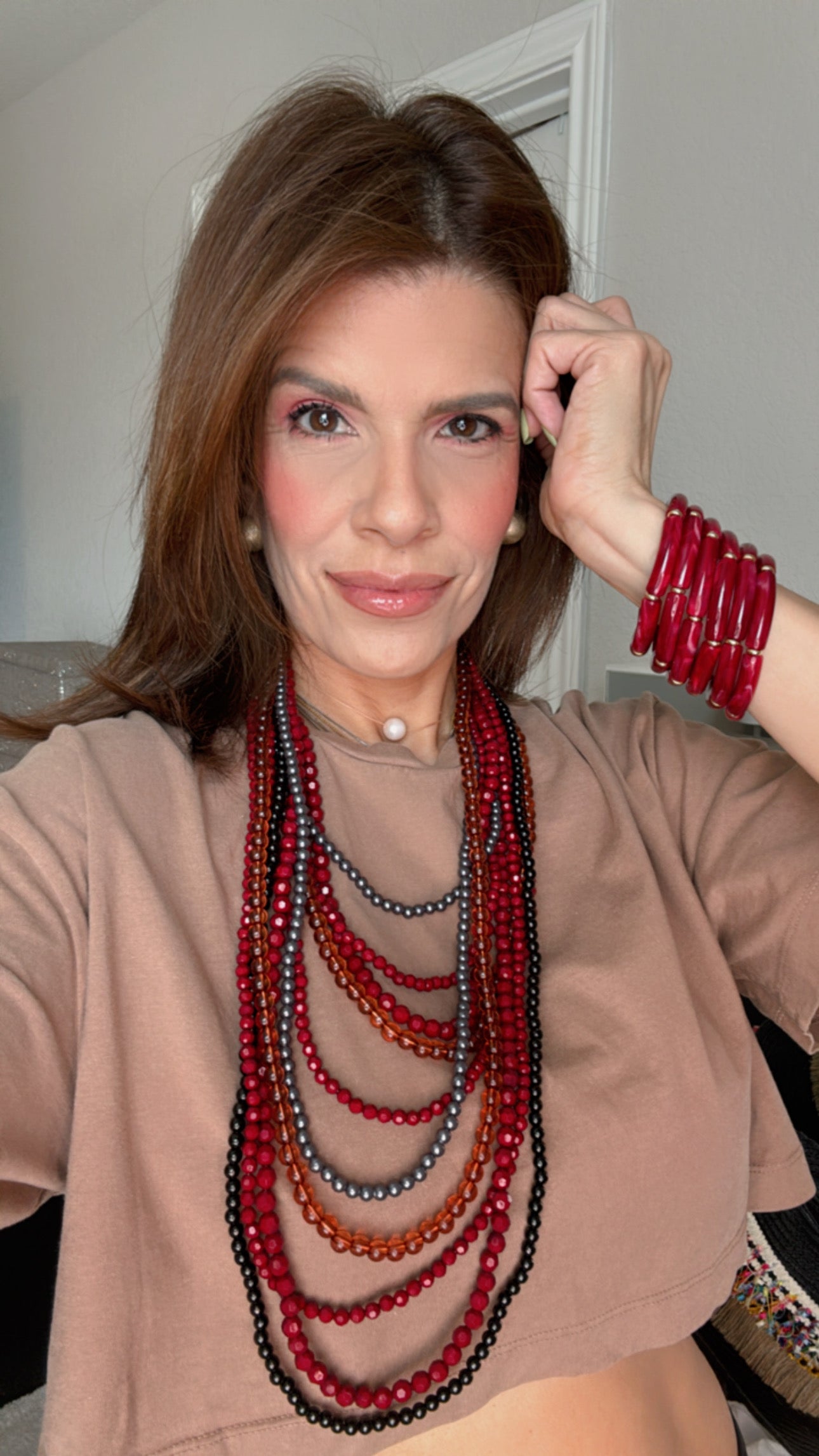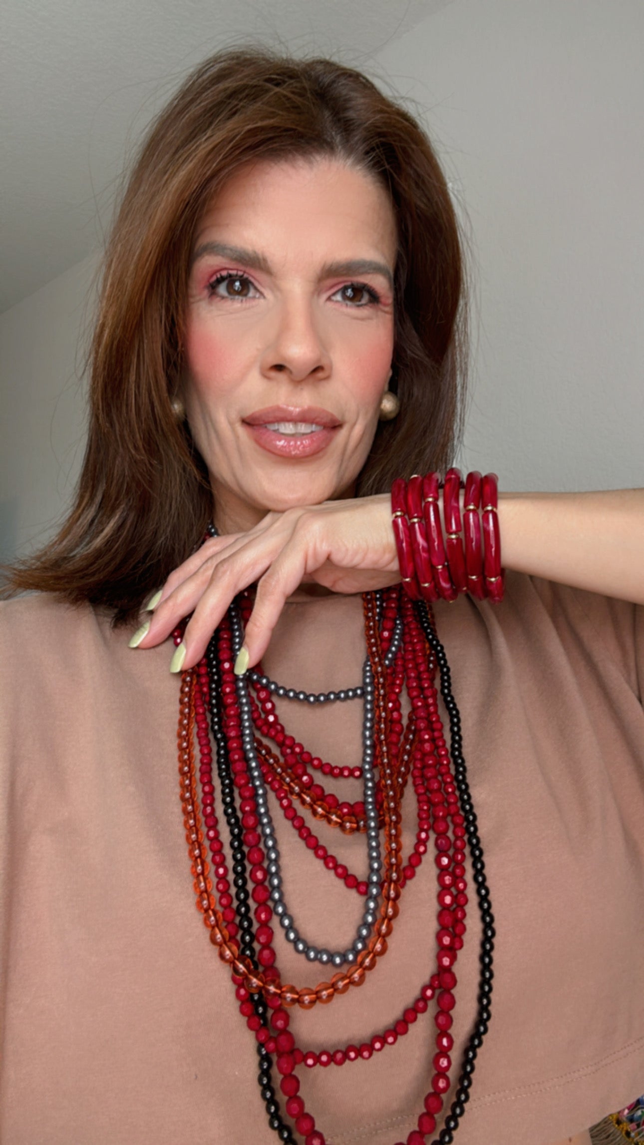 Dos collares en tonos vino, que juntos hacen la mezcla perfecta! Vienen con un mix de 6 pulseras en tono vino!