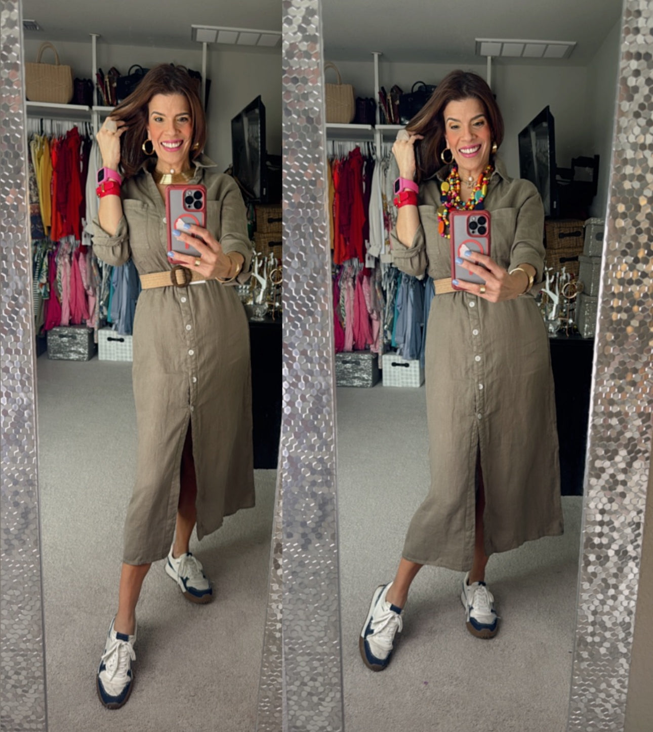 - 💚 Vestido camisero verde oliva con cinturón (Talla M) – $69